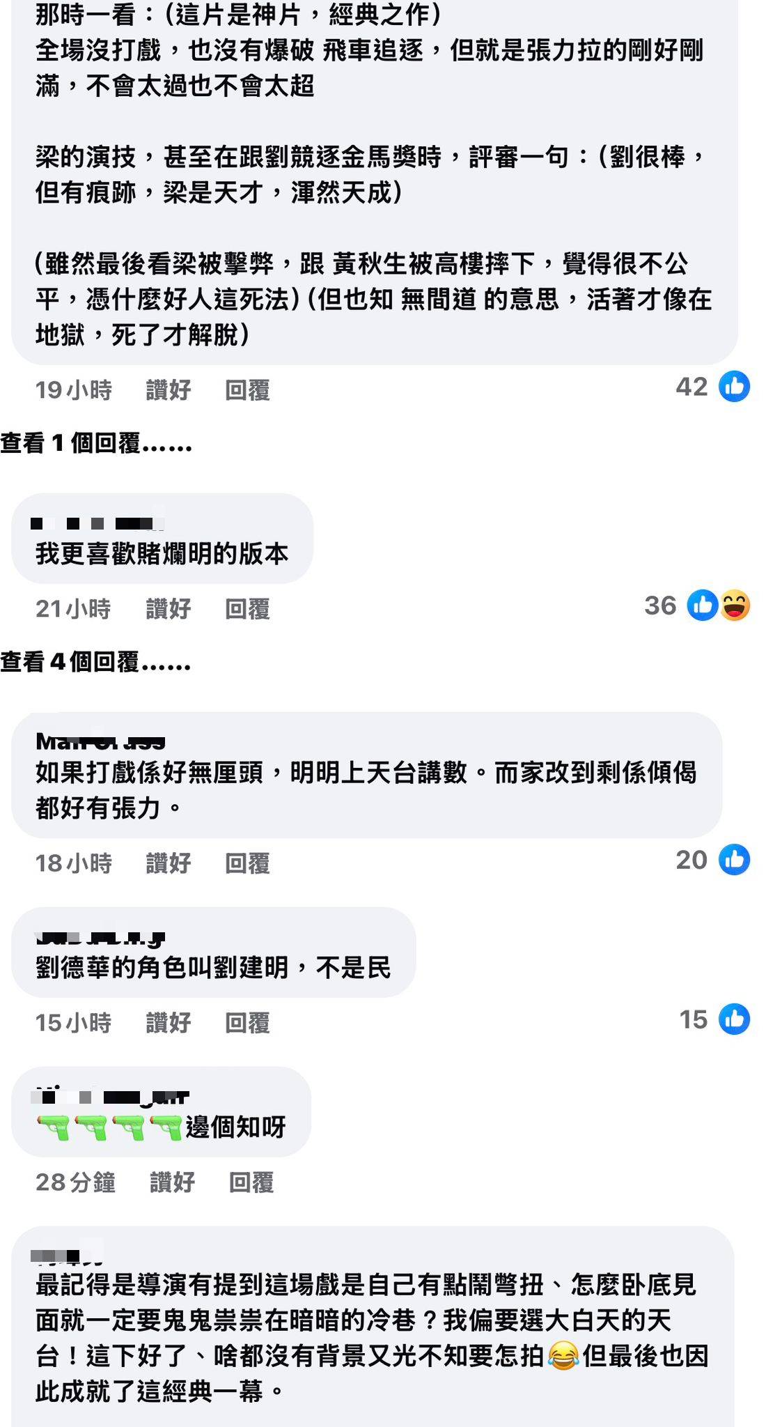 這場由劉德華飾演的劉建明與梁朝偉飾演的陳永仁在天台上的對白,如今已被奉為電影史上的經典之作。兩個臥底身份互相揭穿的瞬間,透過精準的台詞和細膩的演技,將角色內心的掙扎、憤怒、絕望完美呈現。網民在得知這個幕後真相後紛紛留言讚嘆:「那時一看:這片是神片,經典之作。全場沒打戲,也沒有爆破飛車追逐,但就是張力拉的剛好剛滿,不會太過也不會太超。」更有影迷回憶起當年金馬獎評審的經典評語:「劉很棒,但有痕跡,梁是天才,渾然天成。」