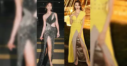 全場最搶眼球的絕對是2022年港姐冠軍林鈺洧,她以超高飽和度的螢光黃色晚裝登場,內裡配搭灰色裙營造層次感。晚裝採用Deep V兼高衩設計,毫不吝嗇展示好身材,不過這個極難駕馭的螢光黃色令她遠看如同一支行走的特大螢光筆,甚至被形容為「剛熟透已剝皮的香蕉」。雖然林鈺洧憑身高優勢勉強撐得起這套造型,但螢光黃容易令人變成「黃面婆」,只能說她勇氣可嘉。她在社交平台貼出相片,騷豐滿上圍兼長腿,並留言:「把夜晚交給夢工場,換取一整晚的童話💛✨ TVB Happy Birthday⭐️」