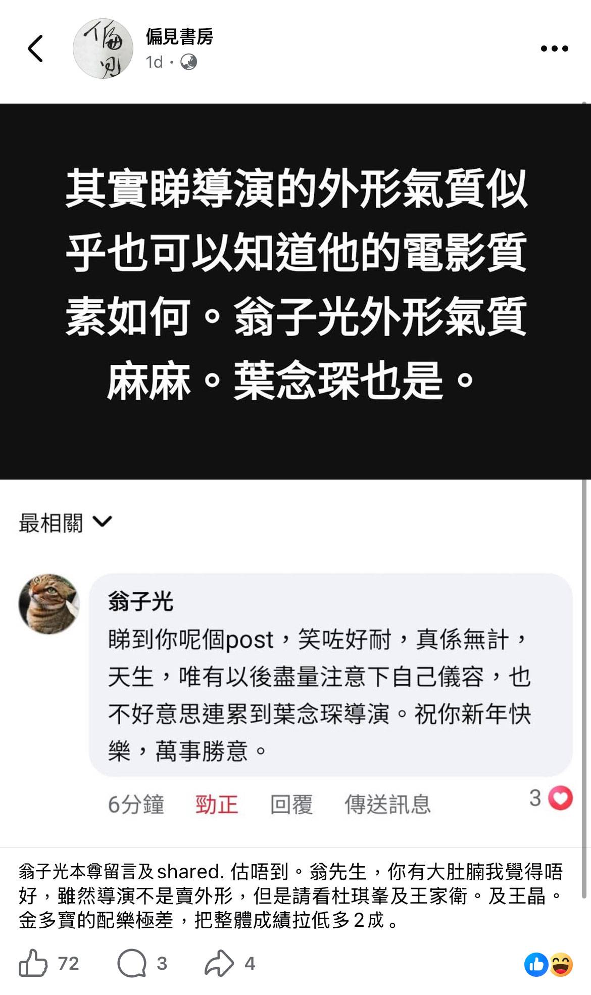 更令人意外的是,平時甚少活躍於社交平台的導演翁子光,竟因為有專頁批評其外貌而親自現身回應。該專頁直言:「其實睇導演的外形氣質似乎也可以知道他的電影質素如何。翁子光外形氣質麻麻。葉念琛也是。」面對如此直接的人身攻擊,翁子光卻以幽默自嘲的方式回應:「睇到你呢個post,笑咗好耐,真係無計,天生,唯有以後盡量注意下自己儀容,也不好意思連累到葉念琛導演。祝你新年快樂,萬事勝意。」這種豁達的態度,反而贏得更多網民的同情和支持。