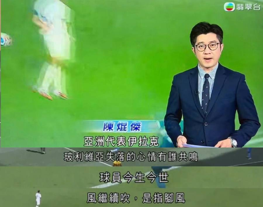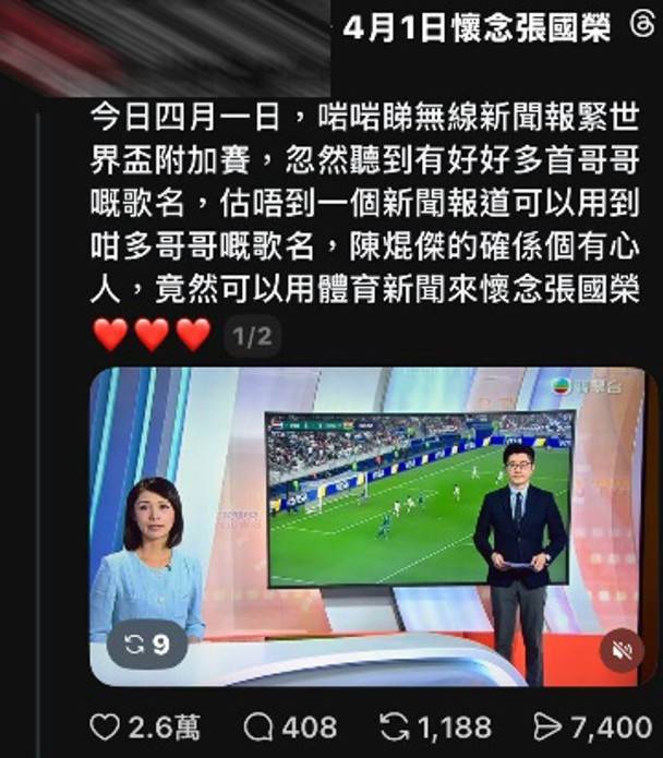 TVB體育新聞主播陳焜傑昨日(1日)在張國榮逝世23周年當日,以一個令人意想不到的方式向哥哥致敬!他在短短分半鐘的世界盃附加賽報道中,神級嵌入超過10首張國榮經典金曲歌名,將原本生硬的足球新聞昇華成感人的音樂致敬,片段流出後瞬間爆紅,網民激讚「有心又有才華」,更有人封他為「伍晃榮接班人」!