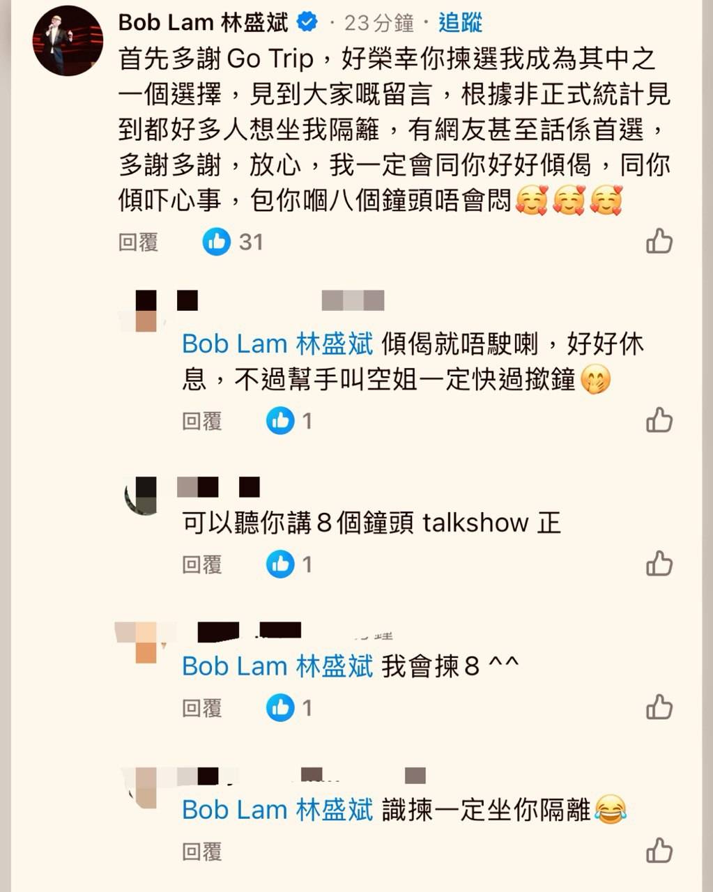 Bob看到網民的熱烈反應後,親自在留言區回應表達感謝:「好榮幸你揀選我成為其中之一個選擇,見到大家嘅留言,根據非正式統計見到都好多人想坐我隔籬,有網友甚至話係首選,多謝多謝,放心,我一定會同你好好傾偈,同你傾吓心事,包你嗰八個鐘頭唔會悶🥰🥰🥰」Bob的回應獲得網民正面回應,有人留言「可以聽你講8個鐘頭 talkshow 正」、「有Bob爺係隔離個心都離一離,講錯。。係個心都定d!」,亦有貼心網民建議「傾偈就唔駛喇,好好休息,不過幫手叫空姐一定快過撳鐘」。