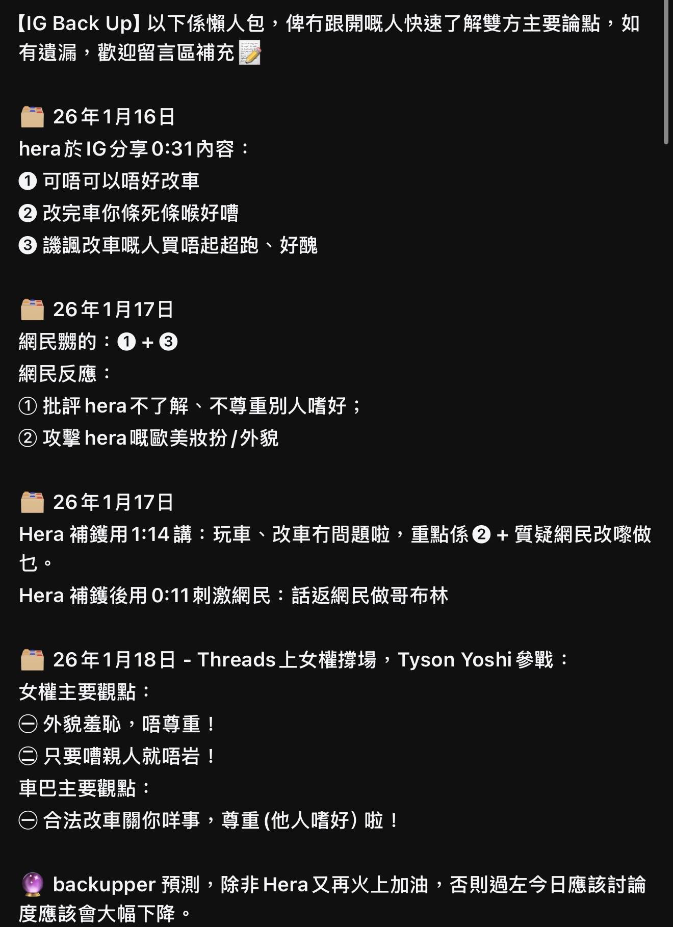 隨著爭議持續發酵,更多不同立場的網民加入討論,事件逐漸演變成更複雜的社會議題。有女權人士直接加入撐Hera陣營,將部分改車愛好者的言論定性為「misogynist(厭女)」行為,認為對Hera外貌的攻擊反映出性別歧視問題。同時,亦有網民整理出詳細的「懶人包」,記錄事件由1月16日Hera發片開始,到1月18日Tyson Yoshi參戰的完整時序,顯示爭議已從單純的改車噪音問題,擴展成涉及性別、階級和網絡欺凌等多重社會議題的複雜討論。