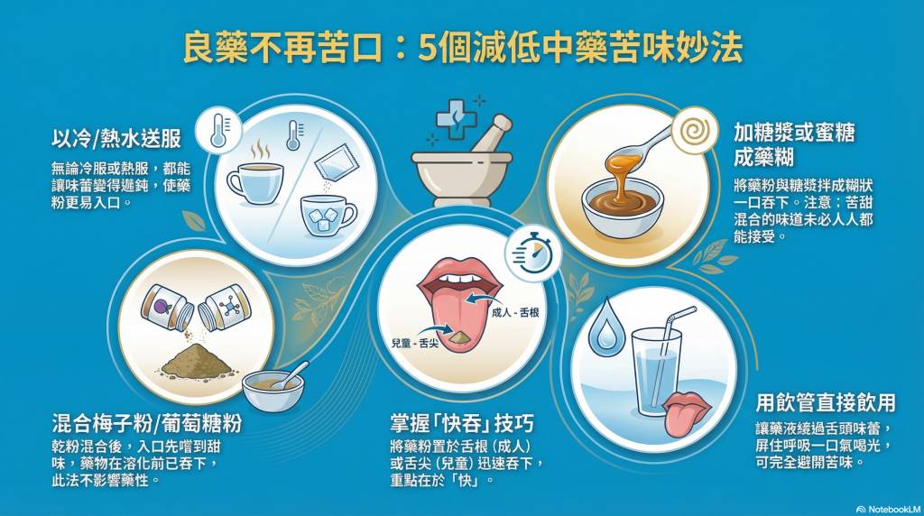從物理角度入手,由於大人的舌根對苦味反應較遲鈍,可嘗試將藥粉直接置於舌根處並迅速吞下;小朋友則可放在舌尖快吞進去。 至於溫度方面各有所好,有人愛冷服以降低苦味感覺,有人愛熱服令味蕾遲鈍。但不論選擇冷服還是熱服,重點都在於一個「快」字,必須迅速將藥液吞入肚中。
